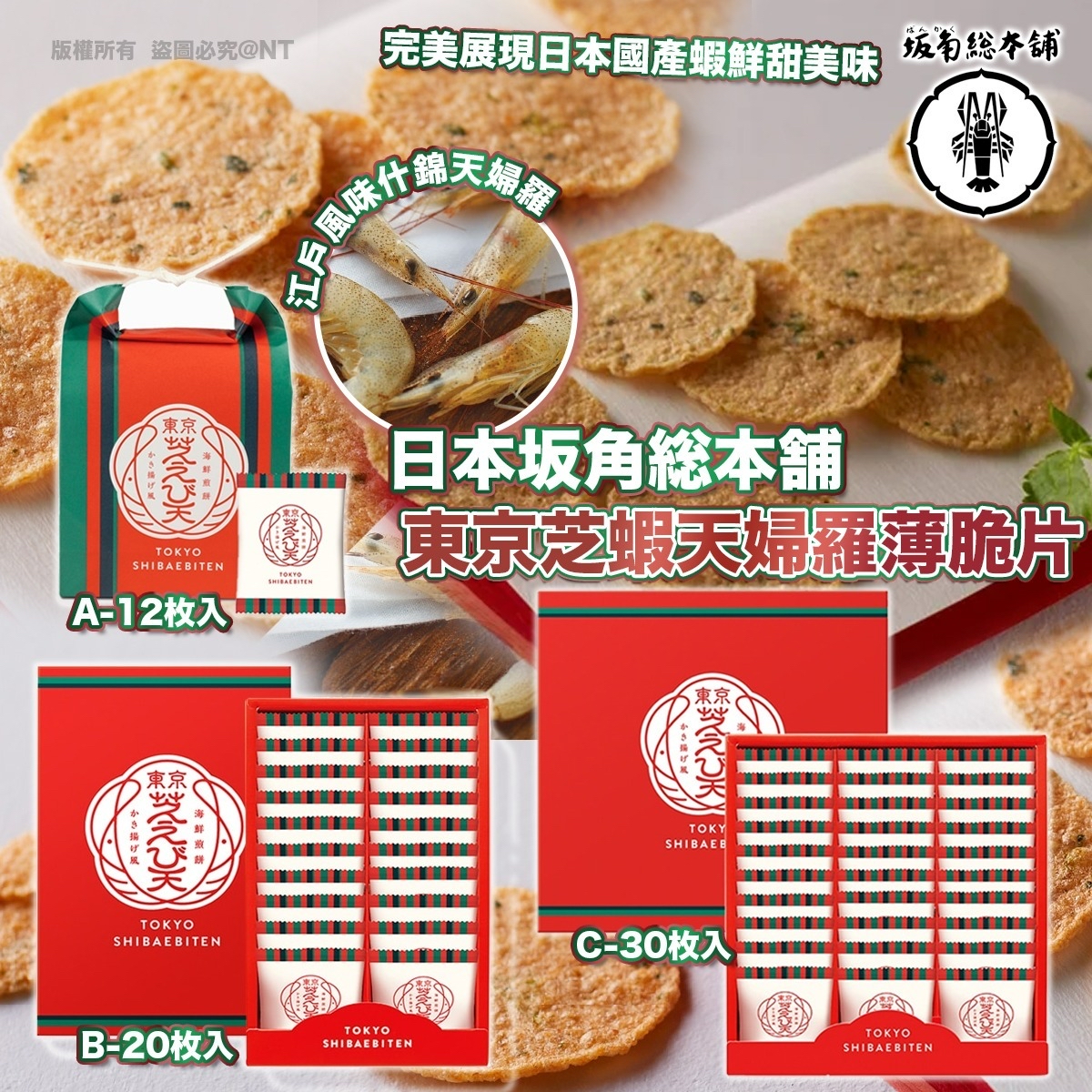 (新年團)日本坂角総本舗|東京芝蝦天婦羅薄脆片 A-12枚入 $88 B-20枚入 $128 C-30枚入 $188 預計2月上旬到貨 蝦片食得多😆,但單獨用一款蝦🦐做嘅蝦片就唔多見啦🤩 😜襯今次機會好好品嚐下👏🏻👏🏻 芝蝦🦐喺江戶時代💁🏻‍♀出名的食材之一 「芝」喺因為🌊呢種蝦盛產於東京的「芝浦」地區🗾而得名 體型約在10~15cm📏,表面佈滿黑色點點🔎,蝦味極致濃郁😋 常用於製作✅玉子燒、天婦羅和蝦煎餅,為料理🆙提升鮮味 呢款蝦片👨🏻‍🍳以江戶料理🍤炸什錦形式呈現🫶🏻 加入大量芝蝦製作🙌🏻,以芝麻 & 海苔增添💥香氣層次 完美展現芝蝦的🎉甘甜與鮮味 油炸後🔥輕盈酥脆,空氣中瀰漫著😎滿滿鮮蝦香氣🥰 ⚠本產品含蝦、小麥、芝麻,過敏者慎用⚠ ▪原產地:日本製造 ▪有效期:生產日起60日 ▪保存方法:在室溫下保存,避免陽光直射、高溫、潮濕的地方。 ❣顏色或因拍攝器材或顯示螢幕等因素而與實物有異 ❣以上圖片及文字僅供參考,一切以實物為準