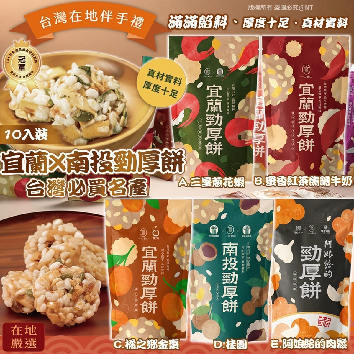 一口宜口 勁厚餅 售價:$69件,2件或以上$59件 A. 三星蔥櫻花蝦口味 B. 蜜香紅茶焦糖牛奶 C. 橘之鄉金棗口味 D. 桂圓口味 E. 阿娘給的肉鬆口味 預計12月底到貨 😋台灣味最勁厚💥【一口宜口勁厚餅】 👏👏宜蘭職人級手作米餅🔥 在地農產 × 無添加 × 真材實料! 👉 每款都好食到唔想分人🍘送禮自用都超有面子! 🌿A. 三星蔥櫻花蝦口味|聯名宜蘭市農會 🌾 雪山鮮米+放牧雞蛋,香脆米香入口即化 🧅 三星蔥青翠多汁+櫻花蝦海味爆香 🍥 在地青出宜蘭合作社&頭城海域櫻花蝦,鹹香酥脆不膩口 🍯B. 蜜香紅茶焦糖牛奶|濃厚甜香層次豐富 🌱 民豐農場有機米+放牧蛋,基底天然健康 🫖 星源茶園蜜香紅茶,蜜韻芬芳、濃香不苦澀 🍯 焦糖牛奶融合茶香,香甜綿密令人回味 🍊C. 橘之鄉金棗口味|酸香解膩 清爽一口 🍊 源自林陳阿鳳阿嬤的初心 自然金棗酸鹹帶回甘,生津又解膩 ✔ 富含果膠+膳食纖維,好味又顧腸胃! 🔥D. 桂圓口味|古法炭焙 果肉Q香 🌰 中寮鄉龍眼乾+龍眼木炭焙 果肉飽滿、金黃Q彈、香氣濃郁 ✔ 香甜不膩,行家指定人氣口味 🐷E. 阿娘給的肉鬆口味|聯名羅東肉焿番 🍖 使用國宴級名店羅東肉焿番招牌肉鬆 🐷 宜蘭CAS豬肉+五十年手工滷汁拌炒 香濃古早味,一咬爆香~鹹甜交織超涮嘴! ▪ 每盒10入裝 ▪ 保存期限:出廠日計180天 ▪ 產地:台灣