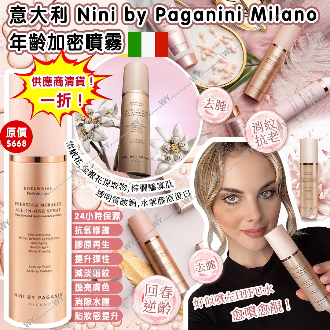 意大利 Nini by Paganini 年齡加密噴霧 售價:$55支 預計12月中到貨 噴一噴😏浮腫、乾燥、乾紋 通通埋單🙌🏻 ‼️ 「愈噴愈靚~ 膠原bb泵到爆瀉😍😍😍」 平時呢支噴噴要4位數字埋單架🤭 今次難得一遇清倉優惠🚨低至一折🈶 $1xx/支 🔥 用最癲嘅價錢嘆下貴族式嘅護理🤞🏻 回春|逆齡|消紋|抗老 |去腫 意大利專業品牌Nini by Paganini Milano💖 多效合一 《年齡加密噴霧》 為每一個愛美人士肌齡加鎖👍🏻Lock人住少女感~ anytime… 都可以噴👀 [妝前]、[妝後]、[瞓醒]、[瞓前]、[打完高能聚焦機後]……. 小分子噴霧 高滲透力~ 搭配純植物萃取的精華水,高效保濕、修護、抗氧化、促進膠原再生,為肌膚深層注入提升能力,持續還原年輕彈力。一噴,定格青春! 💋24小時保濕 💋抗氧修護 💋膠原再生 💋提升彈性 💋減淡細紋 💋提亮膚色 💋消除水腫 💋貼妝感提升 🔥雪絨花🔥抗氧修護、提亮滋潤、舒緩鎮靜,溫和潔淨肌膚,令肌膚柔軟滋潤 🔥金銀花提取物🔥有消炎、殺菌、解毒、去痘、平衡肌膚的功效。也能有效消滅自由基、增強肌膚抵抗外物刺激以及淡化色斑、促進暗瘡痊癒 🔥棕櫚醯寡肽🔥棕櫚酸和多種氨基酸的混合物,促進細胞健康運件功能。刺激真皮層內膠原蛋白和彈性纖維的再生,恢復肌膚彈性和緊緻度,同時提升肌膚的含水量,減少細紋 🔥透明質酸鈉🔥強效的保濕及滋潤劑,可保存其重量1000倍的水份,為肌膚吸收及鎖緊水分。有助於提高皮膚中的水分,並減少表皮水分流失。有助於令肌膚柔軟平滑,並減少細紋和皺紋 🔥水解膠原蛋白🔥改善微循環,改善細紋及皺紋,使肌膚緊緻有彈性。同時有效抑制黑色素,美白肌膚 ◾保質期2025年12月25號 (開封後12個月內使用)