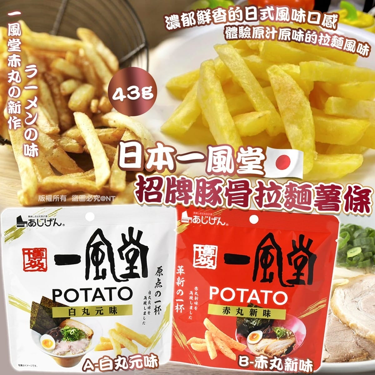 日本一風堂招牌豚骨拉麵薯條(一套2包) 售價:$55套,2套或以上$45套 A-白丸元味 B-赤丸新味 預計12月底到貨 🍜✨日本拉麵控級新零食登場‼️ #一風堂薯條 #豚骨拉麵味薯條 #日本製限定款 🔥「食唔到拉麵?咁就食拉麵味薯條啦!」🔥 🐷兩款人氣口味一次滿足👇🏻 🩵 白丸元味(經典豚骨) 14小時熬煮+24小時熟成的湯頭精華💫 化成濃郁豚骨香氣,一口重現正宗一風堂拉麵風味🍜 ❤ 赤丸新味(辣味噌融合) 自家香油與赤味噌調和,層次豐富🔥 鹹香+微辣+麥味噌香=完美平衡💃🏻 🍟 酥脆口感滿分 採用真空炸製技術🌬低溫油炸保留薯仔原味 每一條都香脆乾爽、越食越涮嘴😋 ⚠本產品含小麥、乳製品、大豆、雞肉(A)、豬肉、明膠,過敏者慎用⚠ ▪重量:43g/包,一套2包 ▪原產地:日本製造 ▪有效期:生產日起185日 ▪保存方法:在室溫下保存,避免陽光直射、高溫、潮濕的地方。 ❣顏色或因拍攝器材或顯示螢幕等因素而與實物有異 ❣以上圖片及文字僅供參考,一切以實物為準