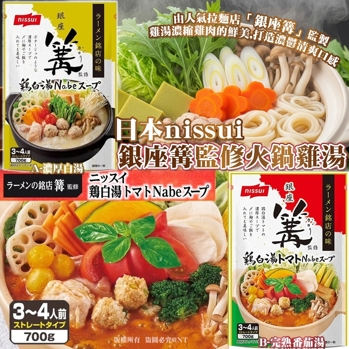 日本nissui|銀座篝監修火鍋雞湯700g 售價:$49包,2包或以上$39包 A-濃厚白湯(黃色) B-完熟番茄湯(紅色) 預計2月底到貨 日本直送✈️打邊邊湯底🥘都要🈶米芝蓮級數🎖 ❤🔥加熱煮沸就食得啦~~🤣準備定材料啦~~ 曾兩度獲得米芝蓮推介👏🏻👏🏻東京銀座超💥人氣拉麵店「銀座 篝」💥 吸引唔少食客🚶🏻日日打排長龍🚶🏻♂,主打🥊超濃厚的白雞湯湯底🐔 以小火慢慢燉煮🔥,完美呈現雞湯🌟終極的「濃、香、純」版本🌟,絕無一點油膩感🙅🏻♀ 咁正嘅湯底😍,只喺煮拉麵🍜,食極都唔夠喉😜 用嚟打邊爐♨先至喺皇道🏆,先食🥬菜肉🥓、最後用🍚飯 or 麵🍝結束,咁先夠完美😎 採用兩種🐓雞白湯精華 & 雞油🦃,以日水獨家🛠「增濃技術」熬製❤🔥 打造💖醇厚、濃郁、綿密的雞白湯💖,鮮味十足😋 想要清爽味道😉,可以揀「番茄版」🤩 加入大量🍅完熟番茄熬製🍅,自帶酸味令雞湯🤤更易入口 點煮都唔會膩口🥰,出街食都未必有咁高質素🥳 ❗注意事項❗ 本產品建議一次過食用完畢,避免保存上有衛生風險。 ⚠本產品含以下過敏源,請慎用⚠ A-小麥、雞蛋、乳製品、大豆、雞肉、豬肉 B-小麥、乳製品、大豆、雞肉、豬肉 ▪重量:一袋700g,約3~4人份量 ▪原產地:日本製造 ▪有效期:生產日起24個月 ▪保存方法:在室溫下保存,避免陽光直射、高溫、潮濕的地方。 ❣顏色或因拍攝器材或顯示螢幕等因素而與實物有異 ❣以上圖片及文字僅供參考,一切以實物為準