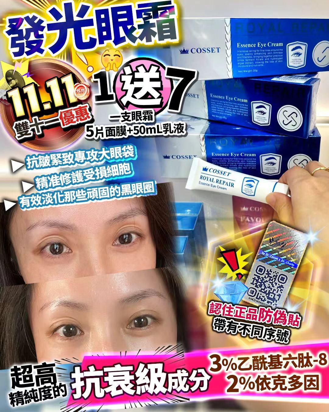 發光眼霜 買1送7(1支眼霜 + 5片面膜 + 1支50ml 乳液) 售價:$199套 預計1月中到貨 供應商 癲左😂 今獲真係豁出去 雙11優惠 買1送7 😱😱 $1xx ‼️‼️‼️‼️ 只要你買一支 眼霜 即送多一支眼霜 + 5片面膜 + 1支50 ml 乳液 💖💖💖 熊貓眼克星!👀 英國 發光眼霜 買1送1 ⚠帶有防偽貼⚠ 🔥抗皺緊致專攻大眼袋 ✨ 一抹擦掉10年痕跡❌告別泡泡眼❌熊貓眼❌細紋 添加的都是超高精純度的【抗衰級】寶藏成分❗其中含有3%的乙酰基六肽-8 ✨護膚界的明星成分✨精准修護受損細胞,有效淡化那些頑固的黑眼圈👁,讓你告別熊貓眼,雙眼重新煥發明亮光彩✨。而且還能改善眼部水腫的問題💦,Morning 起身水腫眼都無埋🔥 🌈仲有2%的依克多因加持👍,這可是超強的保護盾🛡!它能增強肌膚的抵抗力,抵御外界環境對眼周嬌嫩肌膚的傷害💪。長期使用下來,眼周的小細紋會逐漸變淡直至消失不見👋,下垂鬆弛的眼睛緊緊提拉起來⬆,恢復滿滿的彈力感,變得飽滿緊致有活力🥰。 ✔ 獲世界知識產權組織專利認證❗ ✔ 超高精純度的【抗衰級】成分❗ ✔ 歐洲制藥標準生產護膚品❗ 英國製