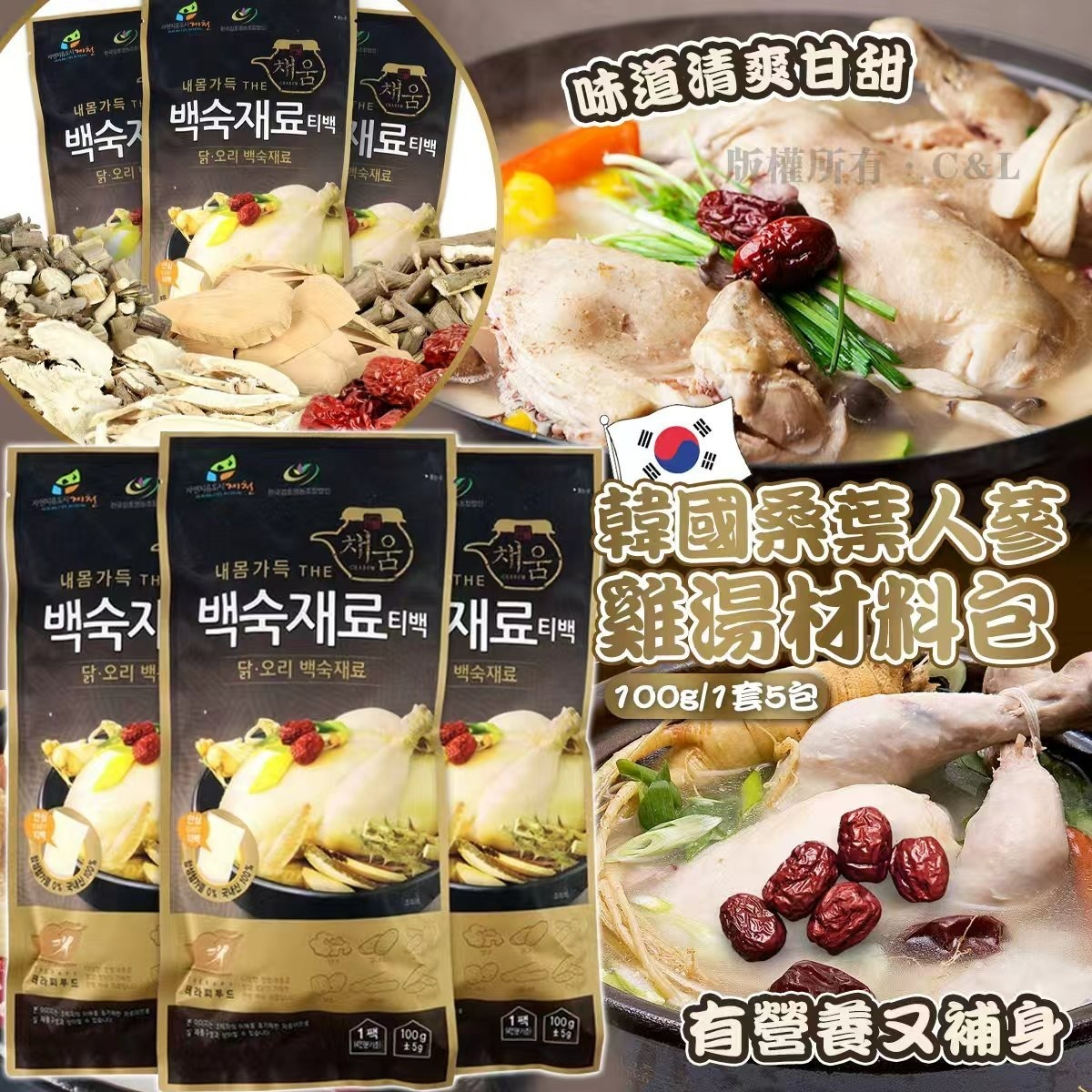 韓國桑葉人蔘雞湯材料包 100g/1套5包 售價:$98套,2套或以上$88套 預計2月底到貨 👏🏻👏🏻👏🏻而家低至$1x/包 #傳統蔘雞湯 #材料包 #四季合宜 #補元氣 👏🏻👏🏻正宗韓味蔘雞湯🍵在家也能輕鬆品嚐 韓國最具代表性美食🍲絕對就是人參雞湯🐔🐔啦!! 燉藥膳! 呢款蔘雞湯調料包,含多種藥膳食材☘桑葉、五加皮、紅棗、黃耆、當歸、人蔘、刺楸…等 其中最特別的就屬含量高達32%桑葉成份 有啲朋友仔唔鍾意太濃烈嘅人蔘味,就可以試試呢款 🌿味道清爽甘甜 🌿營養成分又高 🌿 🔥去韓國必吃的蔘雞湯,現在也可以自行在家烹煮啊👏 🔥冬天非常適合燉補身體,補氣力補全家💪 🔥不會料理的人,只要簡單食材包,就能輕鬆的煮出好喝蔘雞湯🐥 🫕食用方式: 1.將雞肉切塊,丟入冷水鍋內加熱,燙去血水 2.準備一鍋約1.3-2L的水加熱,並將材料包洗淨 3.水滾後將蔘雞湯材料及雞肉放入鍋中一起燉煮 4.先以中火將材料煮出香味 5.再以小火燉煮約20分鐘 6.起鍋前,稍加調味,另可加入蔥段、蔬菜、年糕等 7.煮滾後,就能享用香噴噴的正宗韓國蔘雞湯yummy😋 -規格:100g/包,1套5包 -產地:韓國 ❣顏色或因拍攝器材或顯示螢幕等因素而與實物有異 ❣以上圖片及文字僅供參考,一切以實物為準