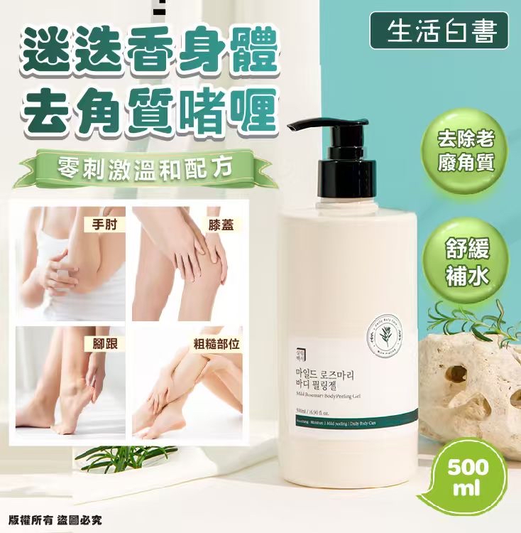 韓國生活白書 迷迭香身體去角質啫喱500ml 售價:$89支,2支或以上$79支 預計12月底到貨 堆積的角質讓肌膚暗沉粗糙?😩是時候給身體一場溫和的煥膚儀式!「溫和迷迭香身體去角質凝膠」以「零刺激溫和配方」為核心,無需浸泡、無需用力摩擦,輕輕按摩即可帶走老廢角質,還原細嫩透亮肌膚。😍 特別添加四大EWG綠色等級草本萃取:迷迭香葉、檸檬香蜂草、奧勒岡葉與德國洋甘菊,不僅溫和溶解角質,更能在去角質同時為肌膚補水、💧舒緩敏感,洗後不留乾澀緊繃,只有水潤柔滑的觸感。 ✅經人體適用測試與皮膚刺激測試認證,連敏感肌也能安心使用。💯清新淡雅的薰衣草草本香氛,讓去角質過程彷彿一場身心療癒之旅。無論是手肘、膝蓋、腳跟等容易粗糙的部位,或是全身大面積使用,大容量包裝都能滿足需求。 🔆告別粗硬摩擦,擁抱溫和煥膚!讓每一寸肌膚都找回天生柔嫩的光采。👏 產地 韓國🇰🇷