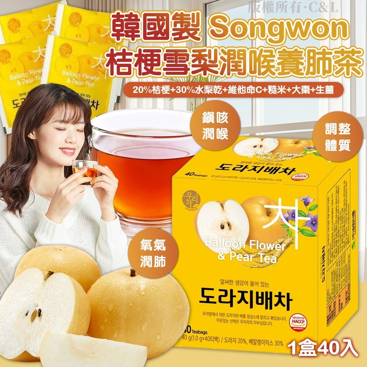 韓國製 Songwon 桔梗雪梨潤喉養肺茶 (1盒40入)