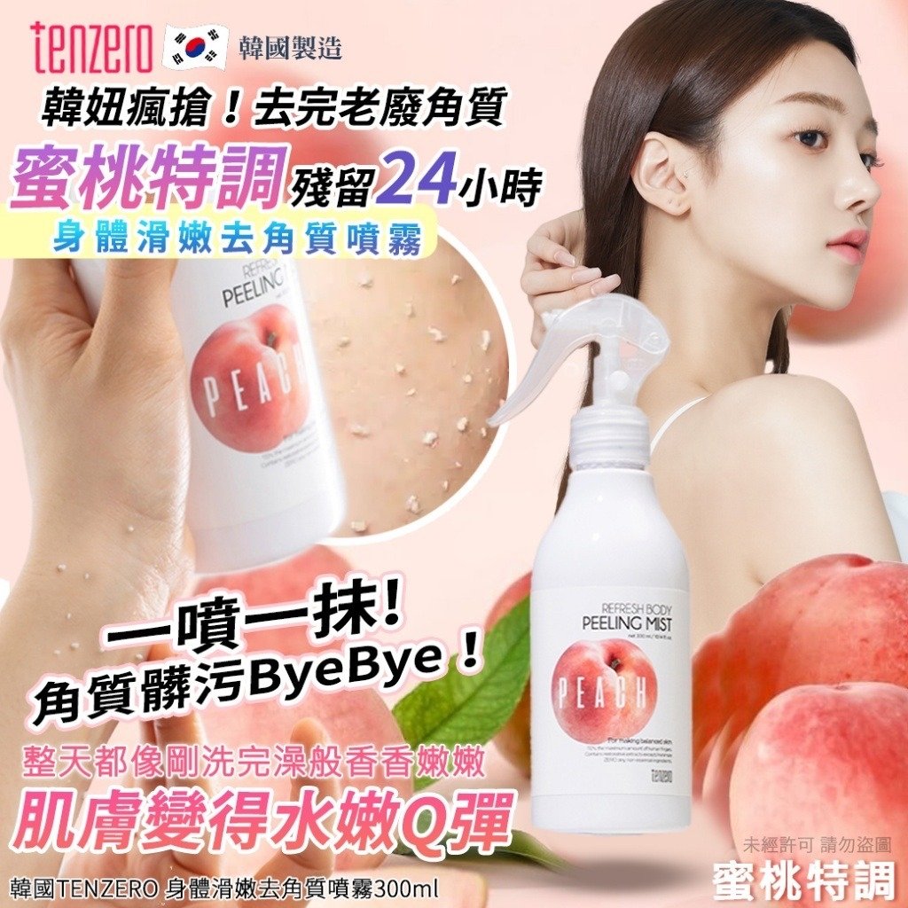 韓國 TENZERO 身體滑嫩去角質噴霧 300ml 售價:$65/支,2支或以上:$55/支 預計12月底到貨 🍑韓妞瘋搶!桃香噴霧洗掉老廢角質✨ 🔥一噴一抹~角質髒污ByeBye! 🔥清新桃子香🌸整天都像剛洗完澡般香香嫩嫩! 每天洗澡後輕輕一噴, 👉不用搓、不用揉,老廢角質自己溶出來~ 👉洗掉暗沉同時帶走油膩&異味 👉肌膚變得水嫩Q彈,滑嫩肌膚忍不住一直摸自己💃 🌿添加溫和植萃保養成分 ✔️幫肌膚保濕不乾澀 ✔️去角質同時滋潤 ✔️散發清甜桃子果香 一支多效 ✅去角質 ✅淨味 ✅清爽保養 ✅香氛加分 -規格:300ml -香味:蜜桃特調 -產地:韓國 📣圖片僅供參考,以實際收到為主 📣包裝: 依季節或每批生產可能略有不同 📣外盒包裝變形、破損內容物無損不影響商品本身使用,恕不接受退貨 📣效期: 商品銷售速度快,每批都是最新生產,依實際出廠為主 ==⚠️ 聲明 ⚠️== 1.本貨品為平行進口正貨 2.所有帖文內容只作分享及參考用途,為免混淆視聽,所有商標或版權均屬有關商品品牌商標的持有人,敬請留意。 3.顏色或因拍攝器材或顯示螢幕等因素而與實物有異,以上圖片及文字僅供參考,一切以實物為準。 4.以上資料及外盒包裝只供參考,商品外盒原廠有更換新包裝權利,一切以實物為準。