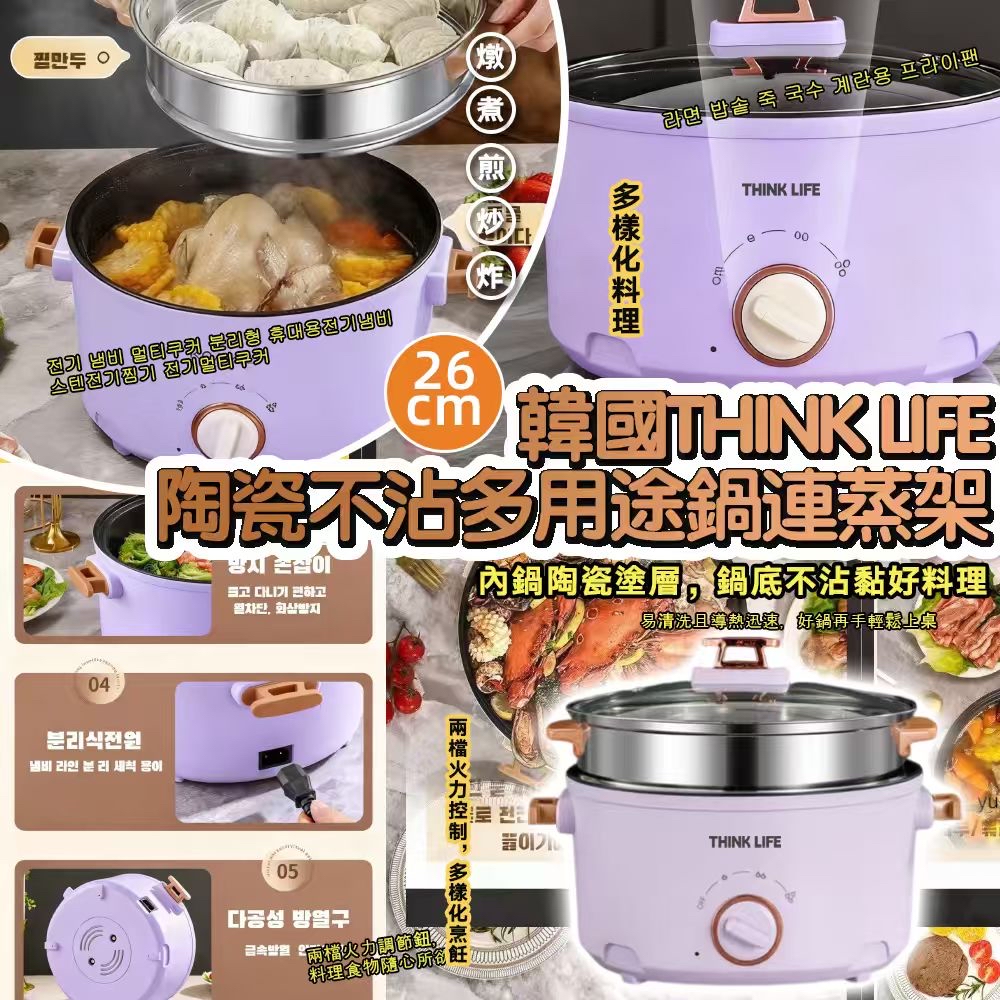 韓國 THINK LIFE 陶瓷不沾多用途鍋連蒸架 26cm 售價:$95/個,2個或以上:$85/個 預計1月中旬到貨 ❌韓國賣緊$299❌ 方便~~~一個pot直接可以煲湯煮食,仲正梗係可以火鍋,可以蒸/煮/炒/炖/煲湯,超多用途。 鍋採用了不沾底陶瓷,可以多用途用,容量夠大,仲送埋蒸架,媽咪們想係屋企點煮都得,超方便~ 💟極簡美型系列 陶瓷不沾鍋塗層 一機多用 💟燉、煮、煎、炒、炸 ,多樣化料理 適用多種美食料理 火鍋/油炸/炒菜/滷肉/早午餐/炊飯等 💟不沾鍋 內鍋陶瓷塗層,鍋底不沾黏好料理 易清洗且導熱迅速,好鍋再手輕鬆上桌 💟兩檔火力控制,多樣化烹飪 適用煎/煲/煮/蒸/炒/鍋物 兩檔火力調節鈕,料理食物隨心所欲 💟極簡設計 啟動指示燈,電源啟動清楚明瞭 雙耳木紋提把,做菜煮飯不燙手 使用木紋提把搭配,質感再升級 透明玻璃鍋蓋設計,烹調狀況一目瞭然 -尺寸:26cm ==⚠️聲明⚠️== 1.本貨品為平行進口正貨 2.所有帖文內容只作分享及參考用途,為免混淆視聽,所有商標或版權均屬有關商品品牌商標的持有人,敬請留意。 3.顏色或因拍攝器材或顯示螢幕等因素而與實物有異,以上圖片及文字僅供參考,一切以實物為準。 4.以上資料及外盒包裝只供參考,商品外盒原廠有更換新包裝權利,一切以實物為準。