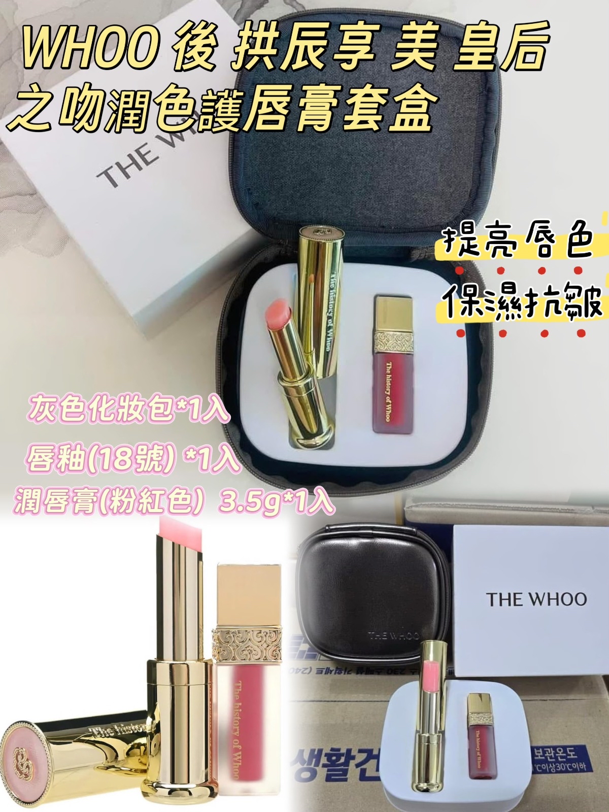 韓國 WHOO 後拱辰享美皇后之吻潤色護唇膏灰色套盒 售價:$135/套,2套或以上:$125/套 預計12月底到貨 🉐有SPF10防曬系數 ✅添加珍貴的保養成分潤澤唇部肌膚及潤色賦予唇部水亮光澤後家的唇膏 ✅網路評價相當好滋潤度很夠,顏色也是非常美是帶有粉嫩色調且質地滋潤 ✅深受護唇控們喜愛素顏或淡妝都很適合,讓人顯得更有氣色護唇膏還會散發著淡淡的花果香~ 🉐蘊含宮廷韓方美容成分清華順氣丹 ✅能夠有效為促進唇部肌膚血液循環,提亮唇色 ✅具抗皺功效 ✅能為粗糙乾燥的雙唇,提供深度保濕效果 🉐當中的紅花粉成分 ✅具天然保濕功效的天然紅色素 ✅為雙唇注入水分同時令雙唇色澤粉嫩動人 -規格: 皇后之吻潤唇膏(粉紅色) 正裝 3.5g*1入(SPF10) 皇后之吻 唇釉(18號) *1入 灰色化妝包*1入 ==⚠️ 聲明 ⚠️== 1.本貨品為平行進口正貨 2.所有帖文內容只作分享及參考用途,為免混淆視聽,所有商標或版權均屬有關商品品牌商標的持有人,敬請留意。 3.顏色或因拍攝器材或顯示螢幕等因素而與實物有異,以上圖片及文字僅供參考,一切以實物為準。 4.以上資料及外盒包裝只供參考,商品外盒原廠有更換新包裝權利,一切以實物為準。