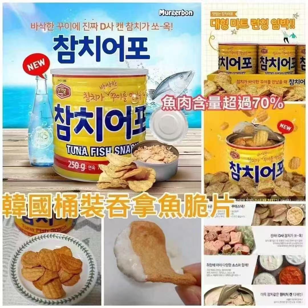 韓國Murgerbon桶裝吞拿魚脆片250g 售價:$88桶,2桶或以上$78桶 預計2月上旬到貨 純正魚肉含量超過70%,食吞拿魚有脆片既口感,食脆片有吞拿魚既味道! 一罐大大罐,一齊開心share,手快有手慢無呀! 韓國人會用黎點沙律醬食,大家都可以試 最重要係不經油炸,以烤焗方式更香脆更健康! 香脆可口 以真正吞拿魚製造,鮮味十足 可以直接食或根據個人喜好點各種醬料 適合一家大小食用,可作簡單小食或下酒菜 原料來自有名的金槍魚鮪魚島 鮪魚本身堪稱是優良免疫棒棒食材,蘊含豐富的鉀、鐵等營養成分,尤其Omega-3脂肪酸、蛋白質、維生素E、B群等等~ 老人小孩都鐘意 可以吃零食又補充健康營養的誰不愛! 讓小朋友老人健康吃零食同時營養豐富 規格:250g 有效期是 2026-08 產地:韓國